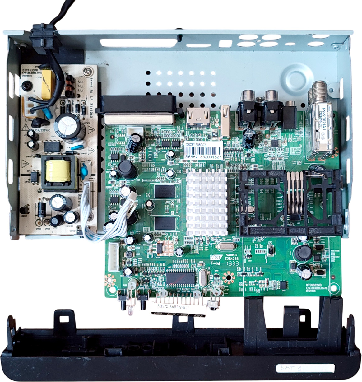 Test : après quelques incertitudes (on l'avait d'abord relié à un port HDMI de la TV un peu foireux), le décodeur boote et affiche une image. OK, son affichage en façade est un peu de traviole : il est retenu à la carte par des pattes fines et on a tellement tourné et retourné la carte dans tous les sens qu'on les a légèrement pliées, basculant l'affichage vers l'arrière.