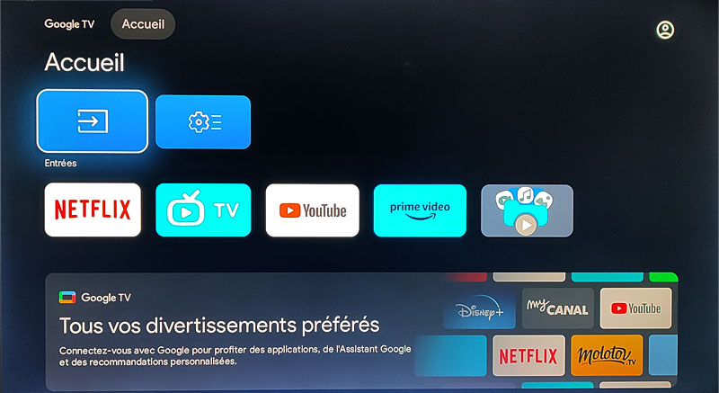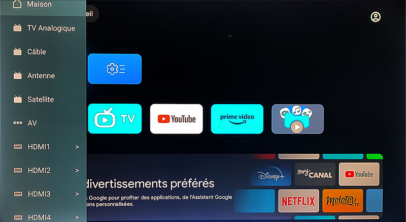 Mais en fait non. Le système nous mène sur l'accueil de Google TV, un accueil un peu épuré car on a choisi le mode de base. Je valide le premier bouton surligné, ce qui fait jaillir un menu à gauche. Il y en a des options ! Qu'il y ait un item par connecteur, je veux bien. Mais 4 items juste pour la TV, sachant qu'un seul va servir… Ça promet beaucoup de scroll. Je choisis Antenne.