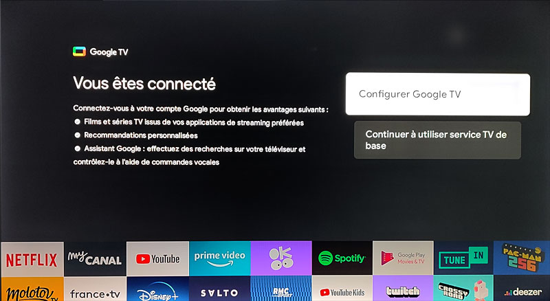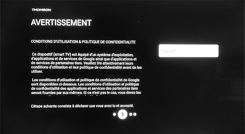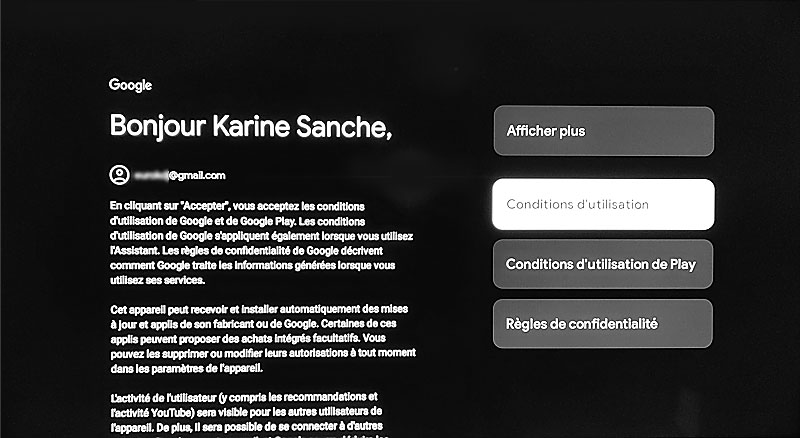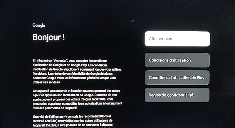 Ensuite, c'est un défilé de demandes d'autorisation, car Android TV est une vraie pompe à données personnelles. Et ça alourdit bien le processus d'installation…