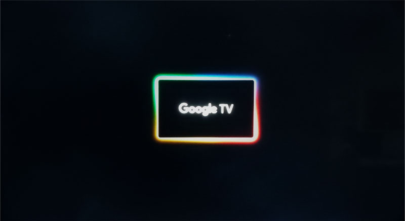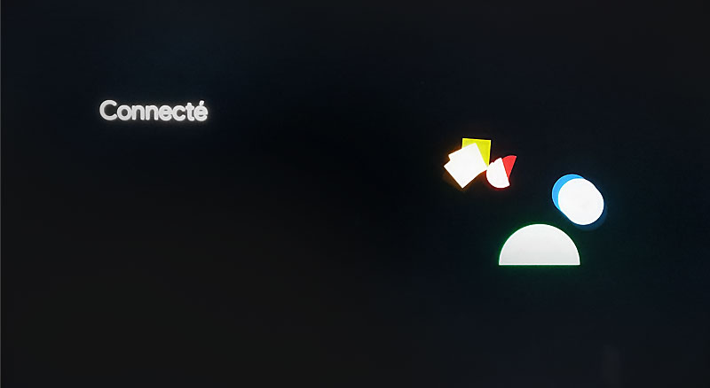 Logo Thomson (on n'y a droit que lors du premier démarrage, d'un reboot système ou de l'installation d'une mise à jour). Trop lumineux pour mon appareil photo, semble-t-il… Puis joli logo Google TV animé avec son cadre arc-en-ciel.
