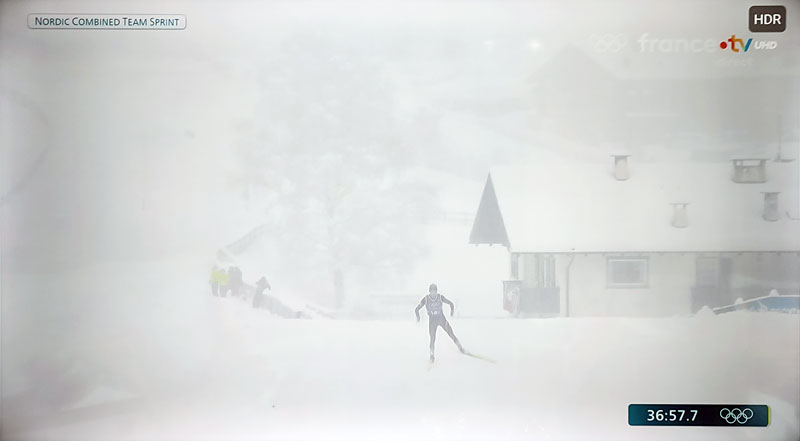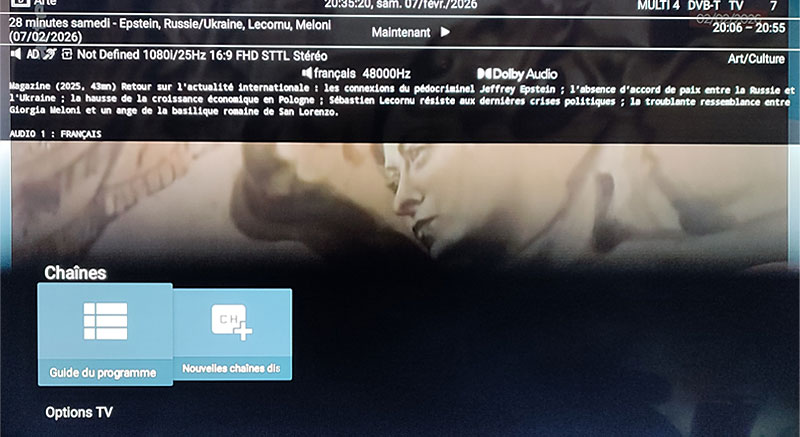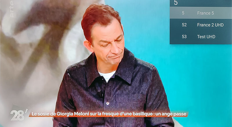 Euh… C'est pas une télé 4K ? Si. Mais les chaînes de le TNT proposant la 4K sont encore très rares en 2026. 2 canaux sont disponibles dans ma région : France 2 UHD (pour les JO d'hiver) et Test UHD (une chaîne qui diffuse en boucle de jolis paysages, et de temps à autres un écran blanc révélant un petit vignetage dans les angles). Une mention HDR (High Dynamic Range) s'affiche brièvement en haut à droite. Mais bon, pas de vraie différence visible avec la 1080p, à vrai dire…