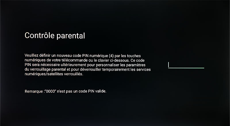 On me demande de définir le code parental, même s'il n'y a pas d'enfant dans la maison. pas moyen de contourner. Et 0000 n'est pas autorisé. Va pour 1234 alors…