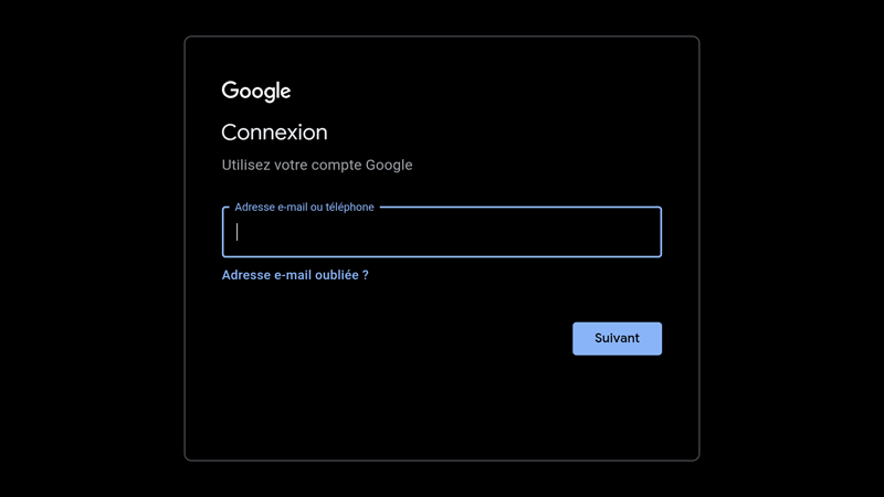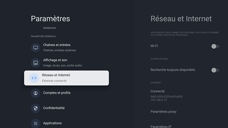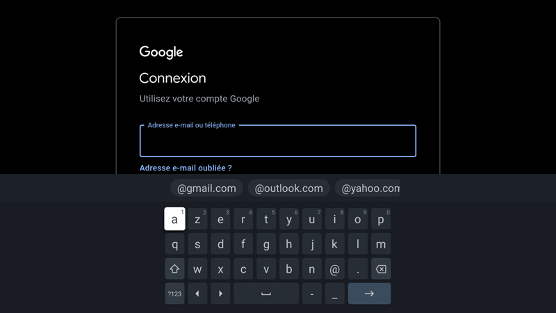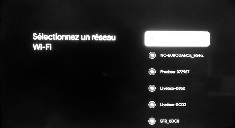 Je connecte la TV à ma box internet via un câble ethernet RJ45 (pas envie de me connecter au wifi, afin de pouvoir contrôler quand la TV sera reliée à internet). La TV met un peu de temps à réaliser qu'elle est enfin online. Et me demande de saisir les paramètres de mon compte Google.