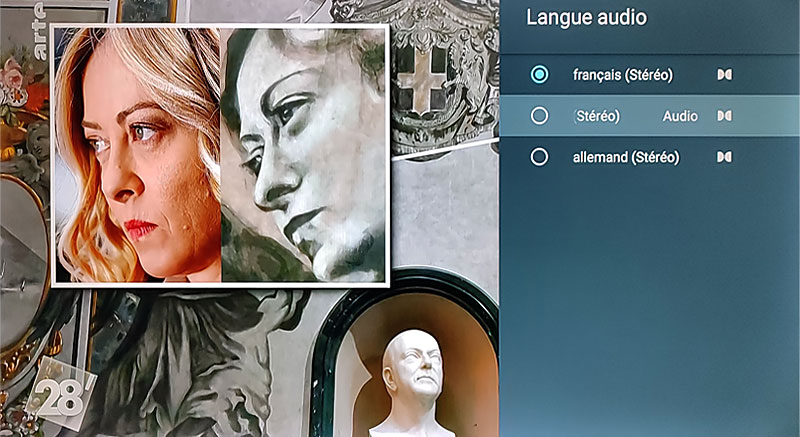 Le menu son est bizarrement intitulé « du son » (pourquoi pas « du bruit » tant qu'on y est). Le Dolby atmos est activé, le mode ambiophonique grisé (une technologie qui donne l'impression au spectateur d'être au cÅ“ur de ce qui se passe à l'écran, une immersion acoustique… mais qui nécessite des hauts-parleurs supplémentaires. Evidemment. Pas pour moi, donc. Autrefois, on parlait de surround)