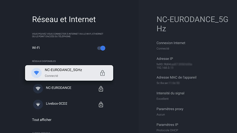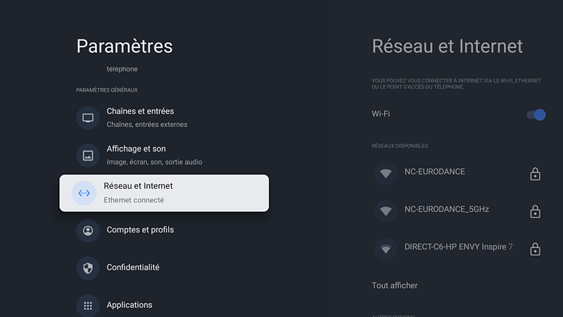 Réseau et internet liste les réseaux wifi à proximité, et permet d'activer ou désactiver le wifi.